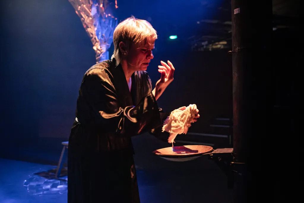 The staging is deliberately and brilliantly spare, until moments when it is so suddenly not, and unfurls a banquet, a battle or a throng of witches, then moments later dispersed again. When the set is bare it is so because it rightfully trusts in the decadence of the company’s performances accompanied by dark pagan undertones and soundscape. In a play where blood isn’t rinsed off so easily, a basin that taunts from the edge of the stage is the standout object of anxiety as it is charged with meaning whenever it is neared.